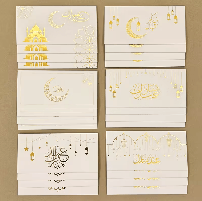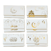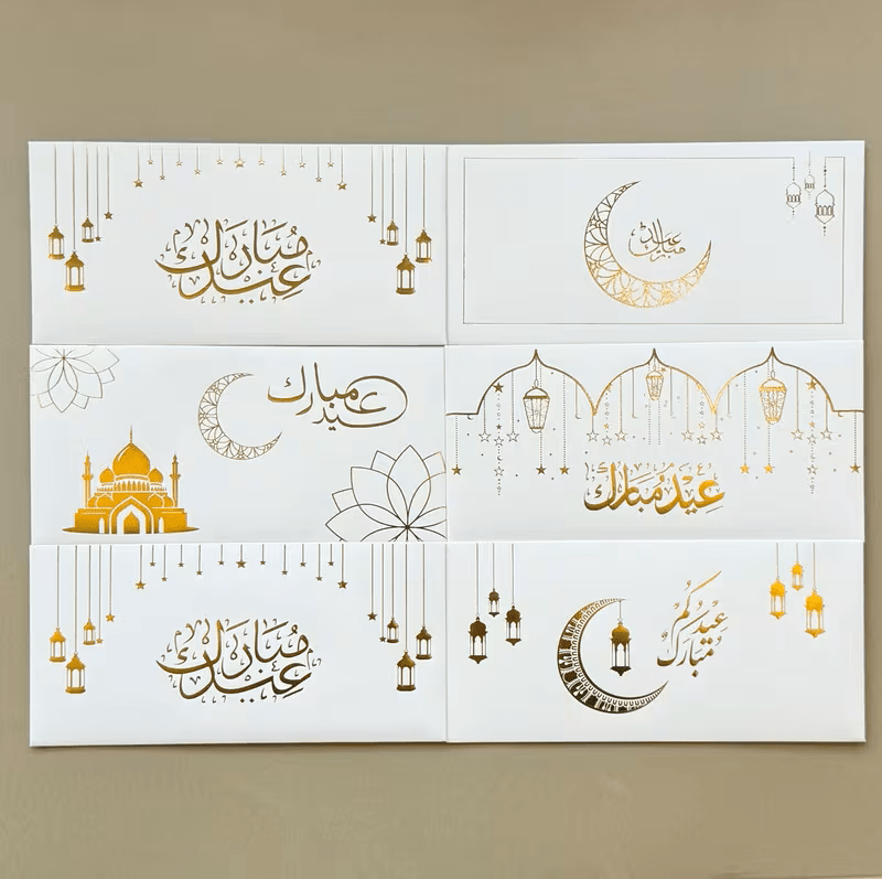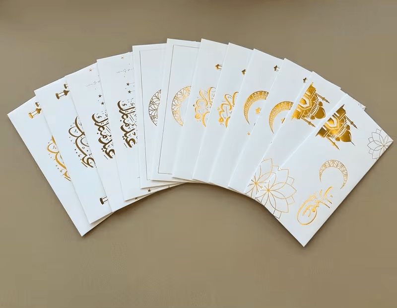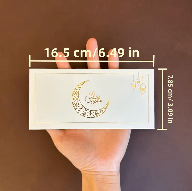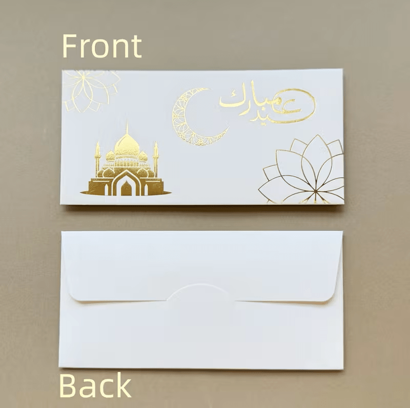أظرف أنيقة بتصميم راقٍ تضيف لمسة مميزة لهدايا العيد، مصنوعة من ورق كرافت أبيض سميك مع نقش ذهبي فاخر يمنحها مظهرًا أنيقًا ومناسبًا للمناسبات الإسلامية