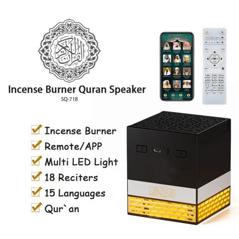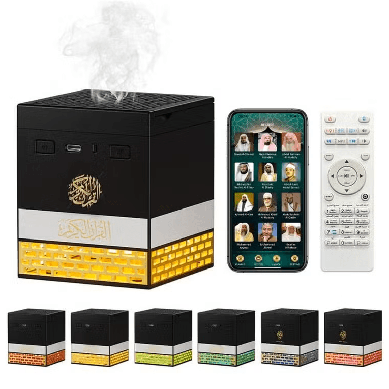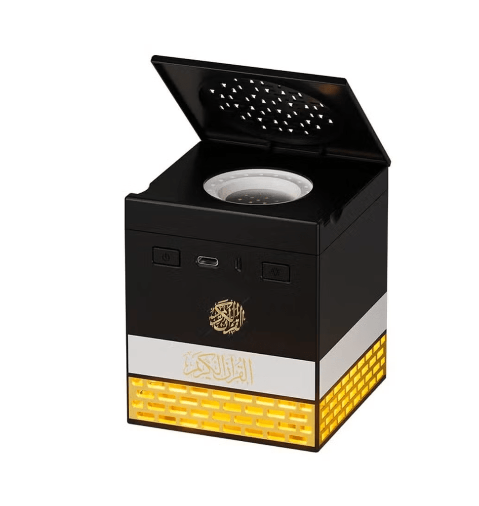 A unique spiritual device that combines Quran recitation with fragrant bakhoor in a Kaaba-inspired design. It creates a peaceful Islamic atmosphere enhanced by multi-color lighting, making it perfect for homes, mosques, or meaningful gifts.