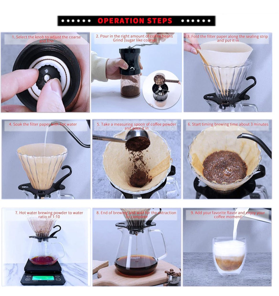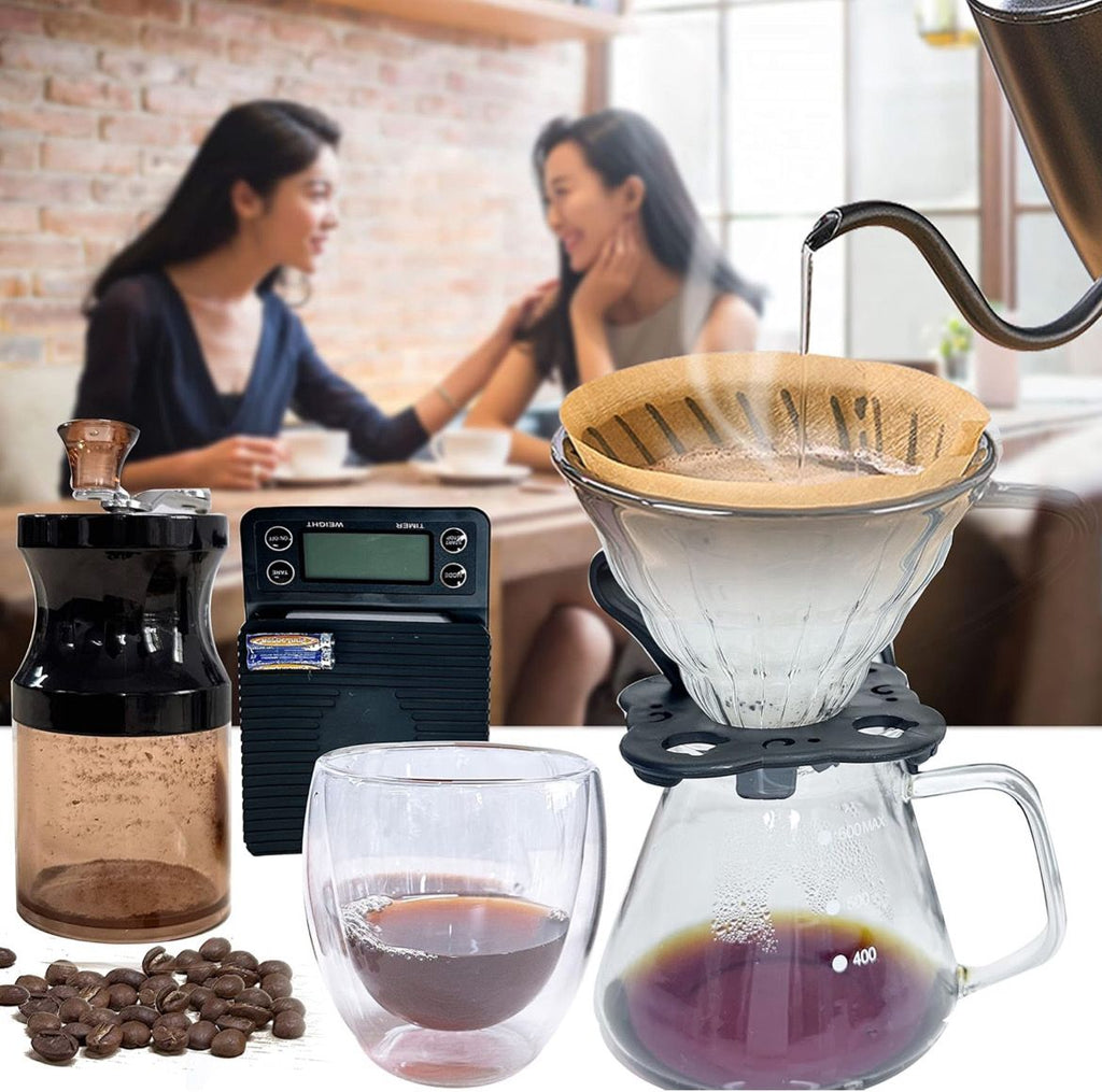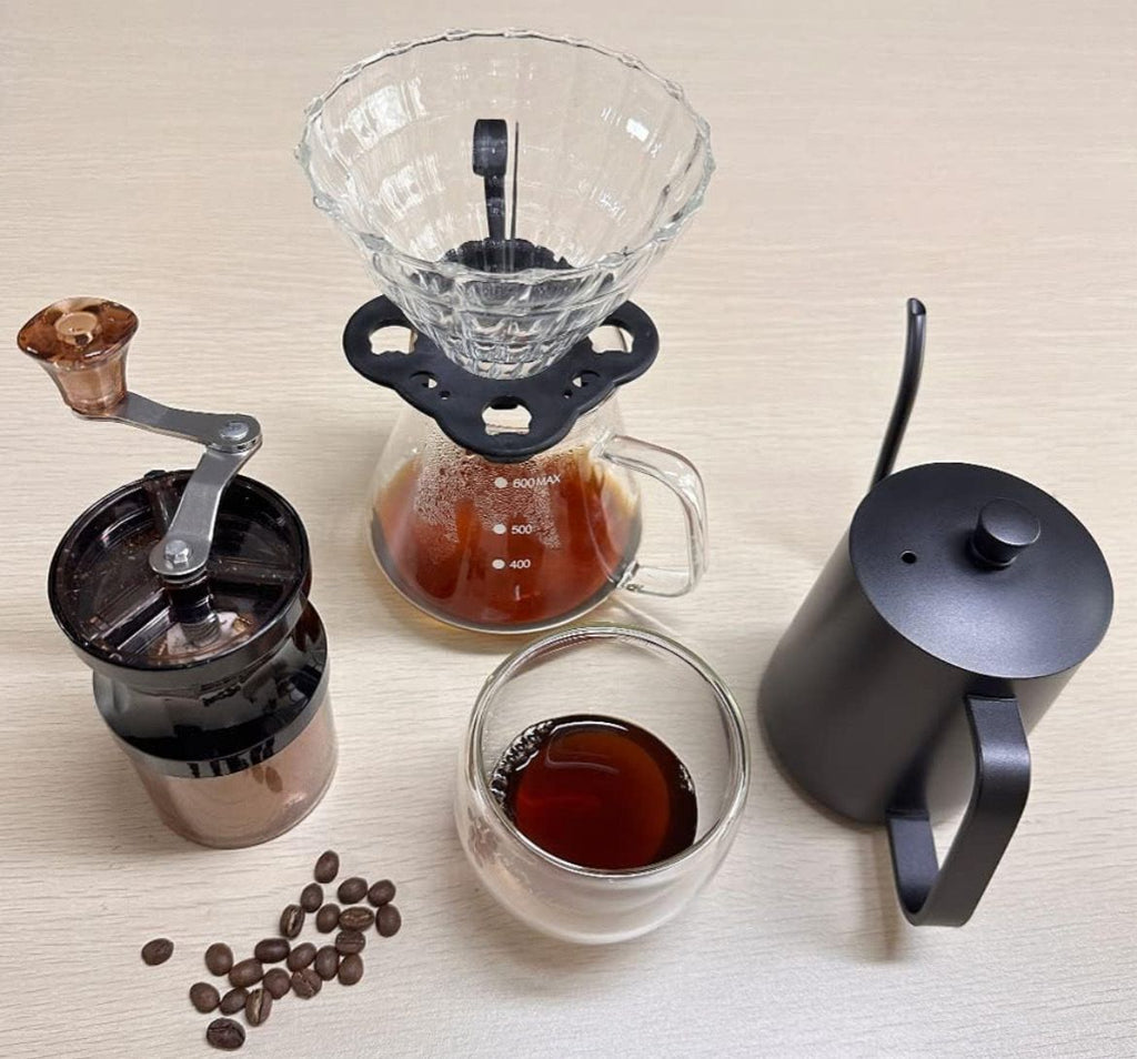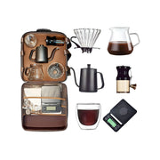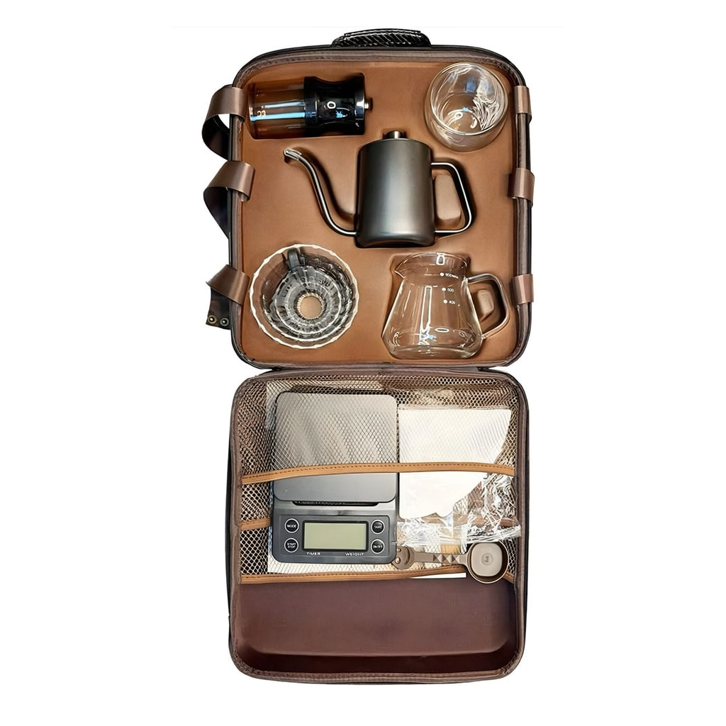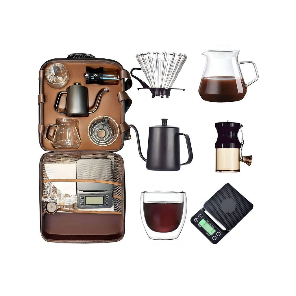 Comes with 8 complete pieces including a scale, grinder, dripper, kettle, double-wall mug, filters, and brewing tools