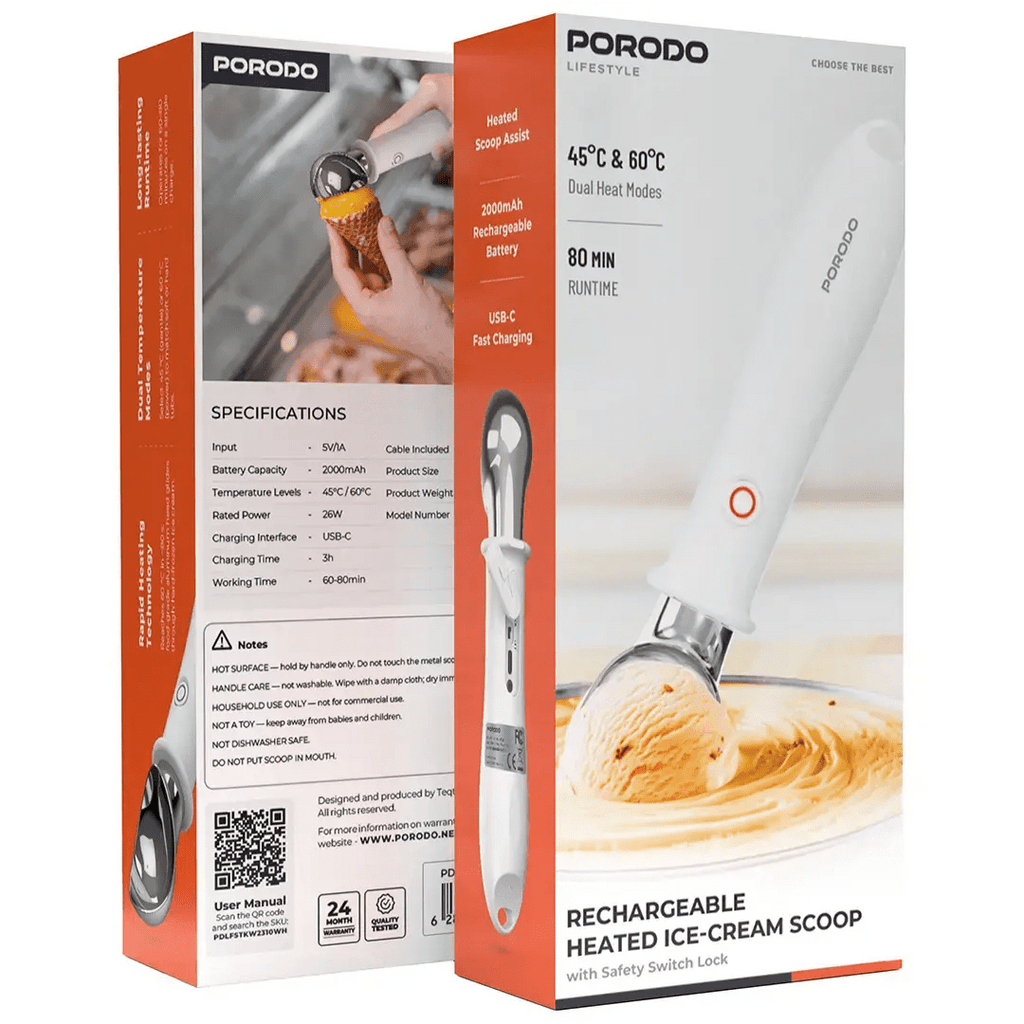 Enjoy effortless ice cream serving with the Porodo Lifestyle Rechargeable Heated Ice-Cream Scoop, designed to glide smoothly even through hard-frozen ice cream. With its built-in heating function, it delivers quick and easy scooping while ensuring maximum safety
