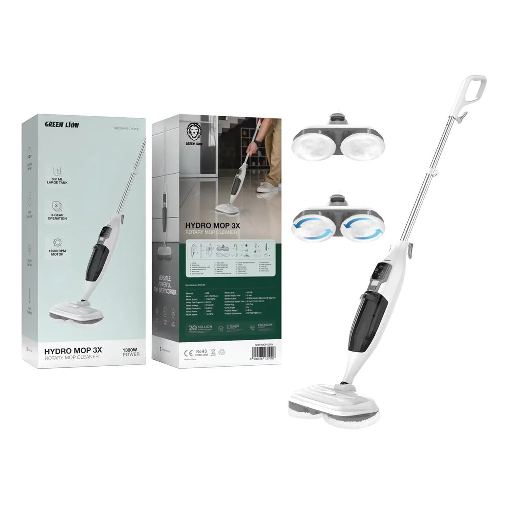 Start with the Green Lion Steam Cleaner, delivering powerful steam that reaches even the tightest corners and tackles tough dirt fast with a 380ml tank and touch screen control. Then, the Green Lion Ultra 3 in 1 Vacuum offers power and convenience with a 1000W motor and 12L capacity, cleaning both wet and dry dirt and coming with multiple attachments for a complete cleaning experience. Finally, the Green Lion Hydro 3X Rotating Steam Mop heats up in 15 seconds, with two 180° rotating heads to cover wider and hard to reach areas, operating quietly with a long cord and a 550ml tank for all your home cleaning needs.