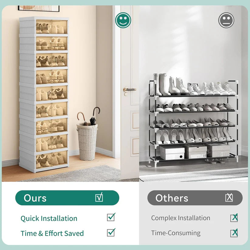 حل عملي وذكي لتنظيم الأحذية والحفاظ عليها مرتبة ونظيفة. يتميز بتصميم متعدد الطبقات مع أبواب شفافة تحمي الأحذية من الغبار وتسهّل رؤيتها، مما يجعله مثالياً للاستخدام في المنزل أو غرف الملابس